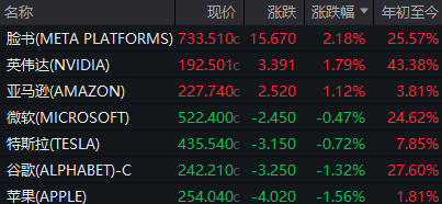 在科技股领域,表现呈现出明显的分化态势。英伟达股价再创历史新高,收盘上涨1.79%(另一说法为1.83%),最新市值达到46778亿美元,成为市场关注的焦点。与此同时,Meta、亚马逊也分别上涨2.18%和1.12%,而微软、特斯拉、谷歌-C、苹果等则出现下跌。