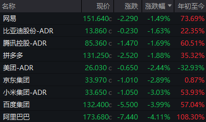 中概股方面,多数个股表现疲弱,纳斯达克中国金龙指数跌2.03%。其中,禾赛科技跌超7%,小鹏汽车、蔚来等跌超5%,阿里巴巴、理想汽车等也跌逾4%。不过,仍有少数个股逆势上涨,如EPSIUM ENTERPRISE涨逾13%,阿特斯太阳能涨逾11%。