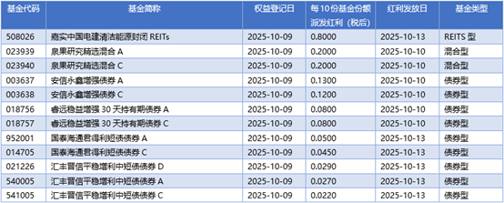 (1)10月09日新发基金共有41只,主要为债券型基金和股票型基金,其中易方达上证580ETF联接A募集目标金额达80.00亿元亿元;基金分红12只,多为债券型,派发红利最多的基金是嘉实中国电建清洁能源封闭式基础设施证券投资基金,每10份基金份额派发红利0.8000元。