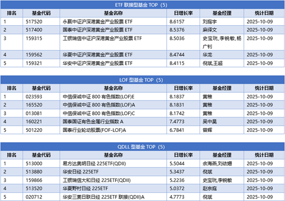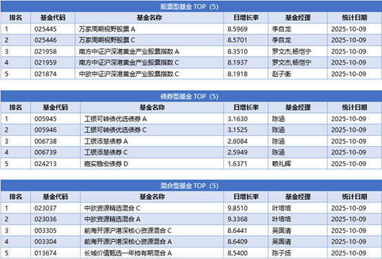 单基金方面,剔除掉 创新封基类型 基金的影响,10月09日业绩表现最好的基金为中欧资源精选混合C,日增长率为9.8510%,其次为中欧资源精选混合A,日增长率为9.3368%、前海开源沪港深核心资源混合C,日增长率为8.6441%。