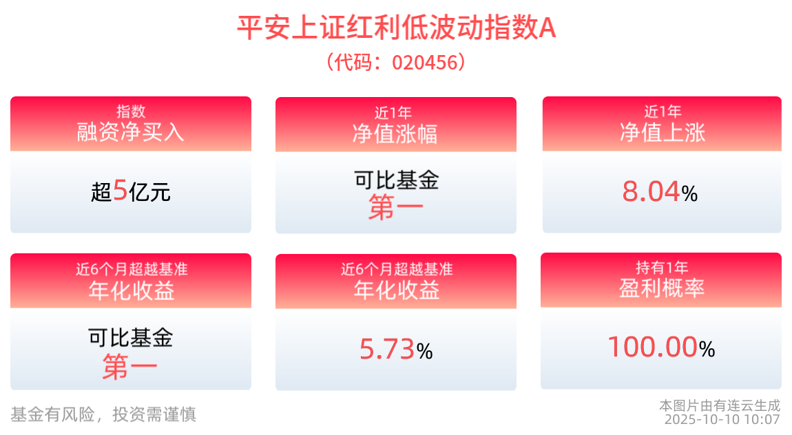 截至2025年10月9日,平安上证红利低波动指数A(020456)近6个月超越基准年化收益为5.73%,排名可比基金1/2。