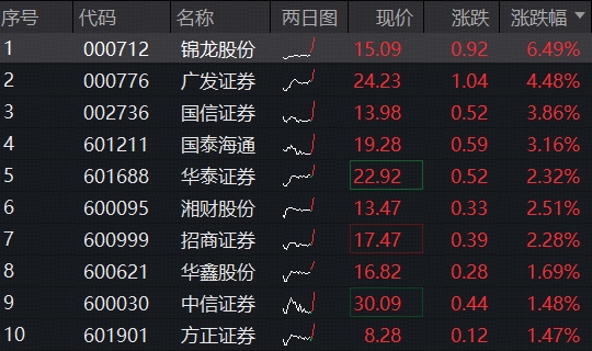 板块个股大面积飘红,锦龙股份涨超7%,广发证券涨超5%,国信证券涨超4%,国泰海通涨逾3%,华泰证券、招商证券、中信证券等涨幅居前。