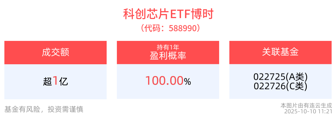 流动性方面,科创芯片ETF博时盘中换手21.58%,成交1.43亿元,市场交投活跃。拉长时间看,截至10月9日,科创芯片ETF博时近1月日均成交1.77亿元。