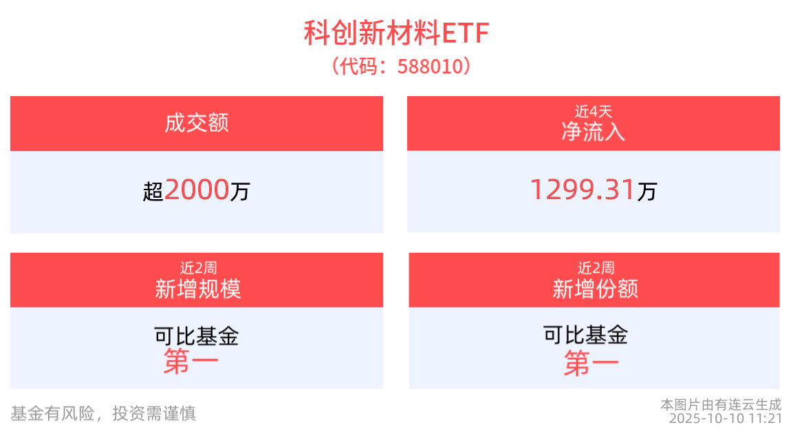 流动性方面,科创新材料ETF盘中换手8.39%,成交2538.52万元。拉长时间看,截至10月9日,科创新材料ETF近1周日均成交3548.19万元,排名可比基金第一。