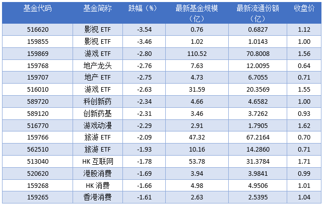 下跌方面,2025年10月09日跌幅最大的是影视ETF(516620),跌幅达到3.54%。排名靠前的影视ETF(159855)、游戏ETF(159869)、地产龙头(159768),跌幅分别为3.46%、2.80%、2.76%。
