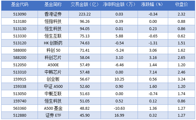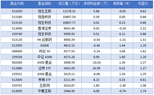 从成交量上来看,2025年10月09日成交量最大的是恒生互联(513330),成交量为12178.31万份。排名靠前的恒指科技(513180)、恒生科技(513130)、香港证券(513090),成交量分别为10897.54万份、10857.77万份、9642.46万份。