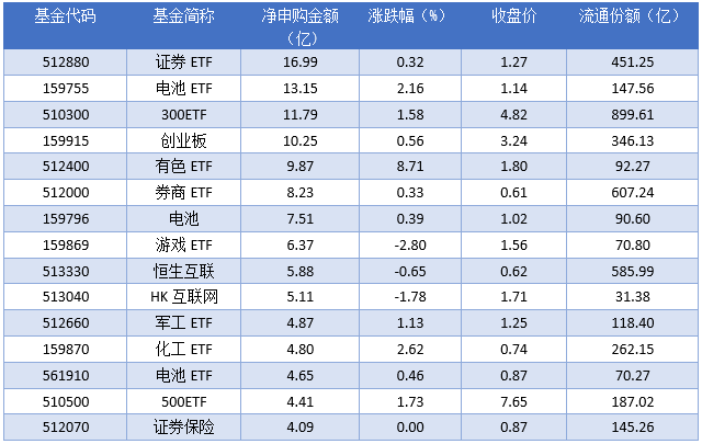 细分到资金流动情况上来看,2025年10月09日净申购金额最大的为证券ETF(512880),当日净申购金额为16.99亿元。排名靠前的电池ETF(159755)、300ETF(510300)、创业板(159915),申购金额为13.15亿元、11.79亿元、10.25亿元。