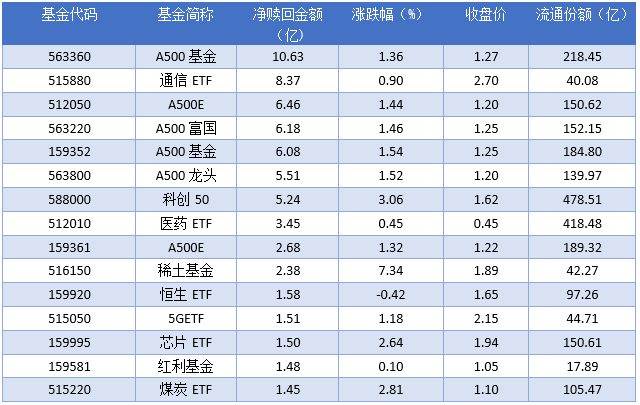 资金流出方面,2025年10月09日净赎回金额最多的是A500基金(563360),赎回金额10.63亿元。排名靠前的通信ETF(515880)、A500E(512050)、A500富国(563220),赎回金额分别为8.37亿元、6.46亿元、6.18亿元。