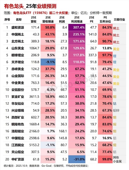 1、从基本面来看,有色龙头ETF(159876)标的指数2025年一致预期净利润增速63%,成份股2025年业绩预期高增长