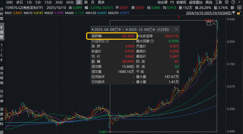 2、从涨幅来看,有色龙头ETF(159876)自本轮低点(4月8日)以来,累计上涨85.30%大幅跑赢沪指(27.04%)、沪深300(31.2%)等主要指数。