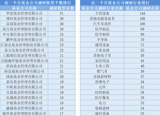 近一个月(9月11日-10月10日),华夏基金参与公司调研的数量最多,共调研31家上市公司,然后调研较为活跃的还有博时基金、富国基金和南方基金,分别调研30家、30家、26家上市公司;从调研行业上来看,基金公司对专用设备行业的上市公司调研次数最多,共有144次,其次是其他电源设备II行业,基金公司调研了108次。