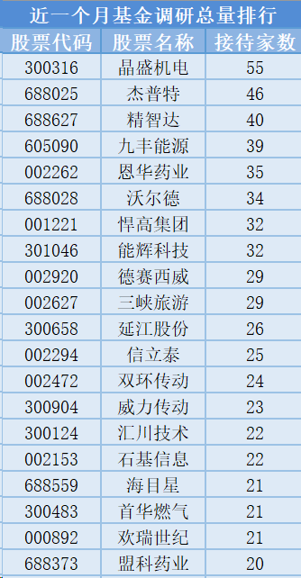 从个股调研情况上来看,最近1个月(9月11日-10月10日)最受公募基金关注的是晶盛机电,属于光伏设备行业,主营业务为半导体装备、光伏装备及智能化、材料业务、精密零部件、售后服务。共有55家基金管理公司参与调研,其次是杰普特和精智达,分别接受46家、40家基金管理公司的调研。