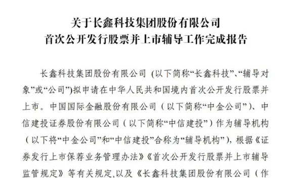 日前,证监会官网显示,长鑫科技已发布IPO辅导工作完成报告,此时距离该公司提交首次公开发行股票并上市辅导备案报告仅过去3个月。