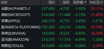 从盘面上看,美股核心板块呈现显著分化,科技股成为重灾区。万得美国科技七巨头指数单日下跌3.65%,成分股中特斯拉跌5.06%、亚马逊跌4.99%、英伟达跌4.89%,三家公司股价均创下近三个月来最大单日跌幅;苹果、Meta分别下跌3.45%、3.85%,微软、谷歌 - C 跌幅相对收窄,但也分别录得2.19%、1.95%的下跌。