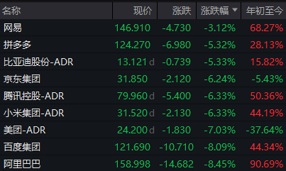 中概股同样未能幸免,纳斯达克中国金龙指数单日收跌 6.10%,本周累计跌幅已达8.37%。个股方面,富途控股跌11.15%,蔚来、晶科能源跌超 10%,哔哩哔哩跌 9.37%,阿里巴巴、百度、小鹏汽车跌超 8%,京东、拼多多分别下跌6.24%、5.32%,仅少数防御性个股维持小幅上涨。