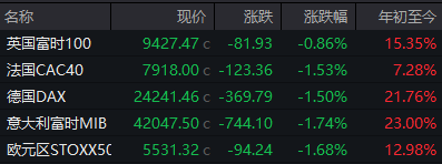 美股的剧烈波动迅速传导至全球市场,欧洲主要股指尾盘集体跳水。德国DAX30指数下跌1.50%,法国CAC40指数跌1.53%,英国富时100指数跌0.86%,欧洲斯托克50指数跌1.75%,此前相对稳健的欧洲市场未能独善其身,反映出全球风险偏好的同步回落。