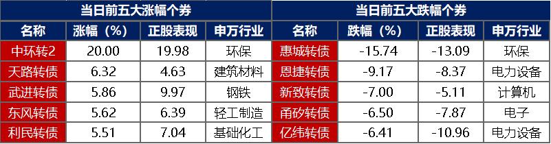 【转债市场主要指数集体跟跌】 10月10日,转债市场跟随权益市场有所走弱,当日中证转债、上证转债、深证转债分别收跌0.45%、0.34%、0.62%。当日,转债市场成交额724.19亿元,较前一交易日放量23.28亿元。转债市场个券多数下跌,423支转债中,164支收涨,240支下跌,19支持平。当日上涨个券中,中环转2涨停20%,天路转债涨超6%;下跌个券中,惠城转债跌逾15%,恩捷转债跌逾9%。