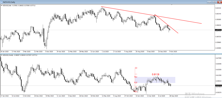 周线级别的走势要比日线更加流畅。图中紫色区域为前一轮下跌波段的0.382~0.618分位处,NZDUSD的反弹最高点0.6119正处于该区间附近,意味着反弹充分,空头趋势延续。叠加新西兰联储超预期降息,7月份至今NZDUSD空头走势延续概率较高。