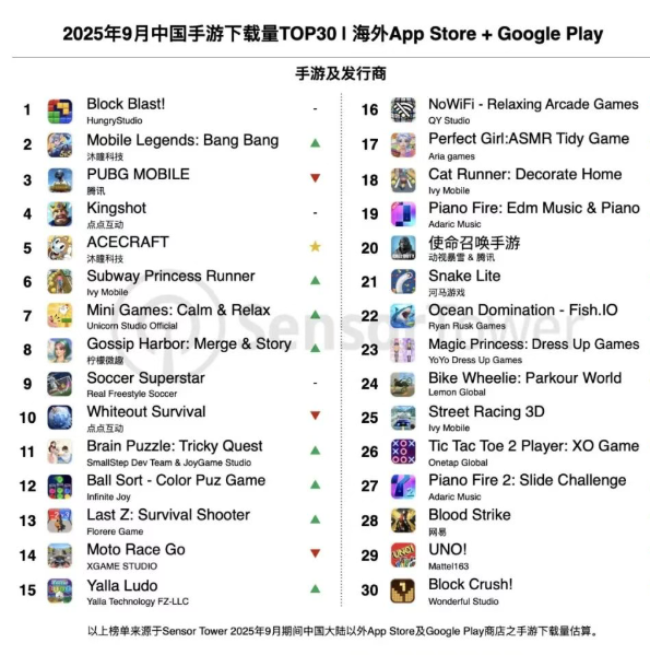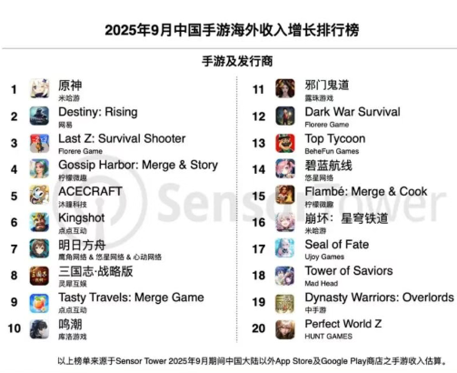 Sensor Tower商店情报平台最新数据显示,2025年9月中国手游产品在海外市场收入及下载量排行榜,详细榜单变化如下。