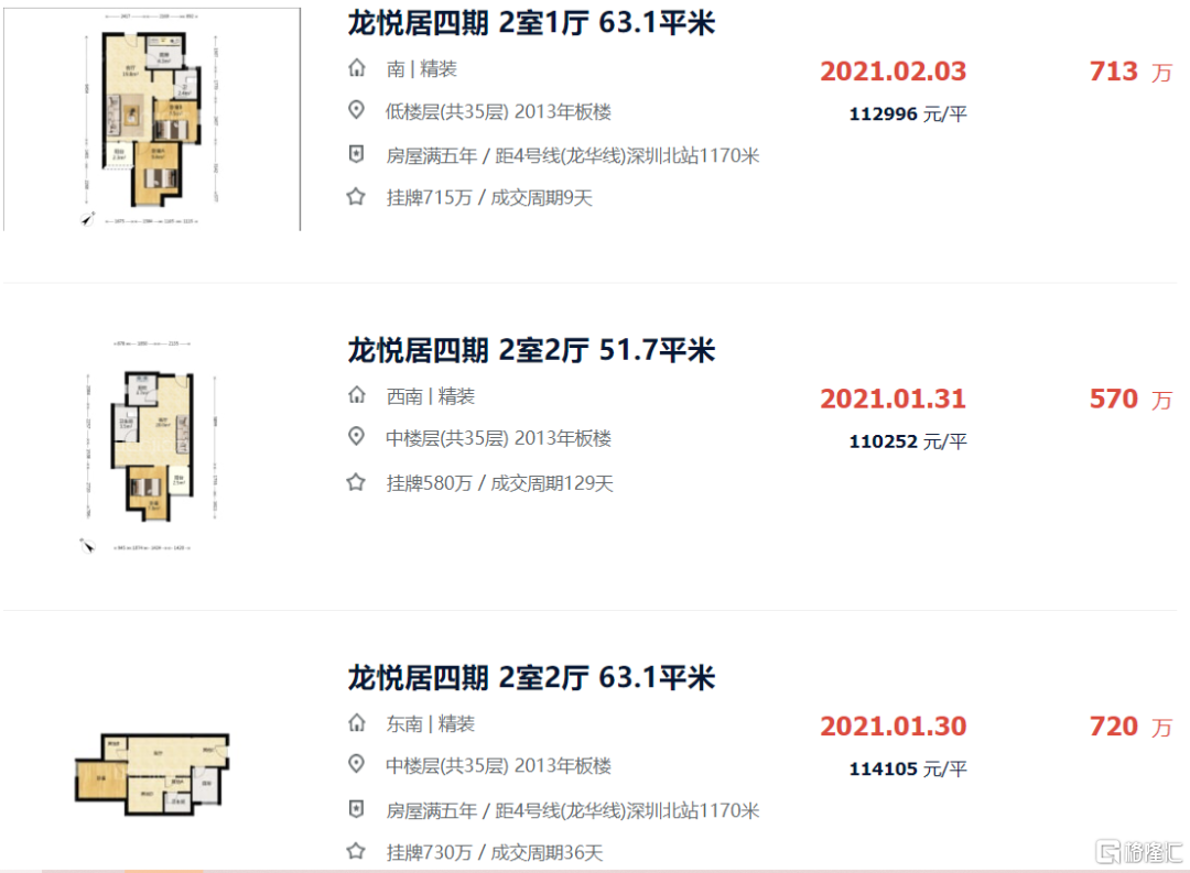 比如位于龙华梅林关的典型小区龙悦居四期,如今63平左右的户型,成交价275万左右,而2021年1-2月同户型成交总价可以去到700万+。