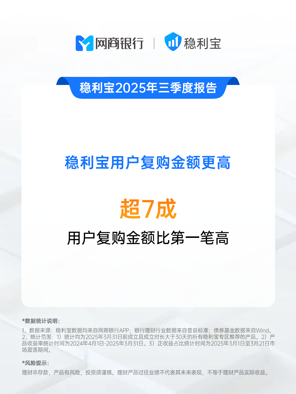 10月11日,网商银行旗下银行理财专卖平台“稳利宝”发布2025年三季度报告。报告显示,在低利率背景下,银行理财平台成为承接居民理财需求的重要品类,稳利宝凭借稳健的收益和普惠的特性赢得更多用户信任。
