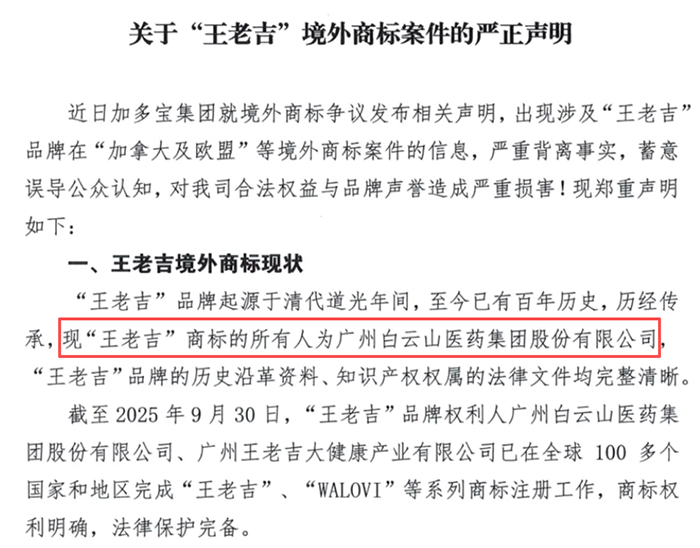 同日晚间,广药集团旗下王老吉品牌通过官方微信公众号发布《关于“王老吉”境外商标案件的严正声明》。声明明确,“王老吉”商标当前所有人为广州白云山医药集团股份有限公司(简称“白云山”),截至2025年9月30日,白云山与广州王老吉大健康产业有限公司(简称“王老吉大健康”)作为品牌权利人,已在全球100多个国家和地区完成“王老吉”“WALOVI”等系列商标的注册工作,商标权利明确,法律保护完备。