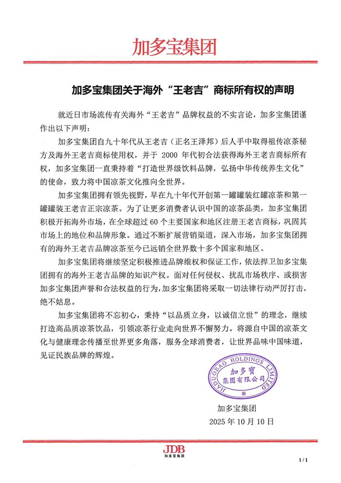 10月10日上午,加多宝集团发布《关于海外“王老吉”商标所有权的声明》再度回应争议。该声明重申其在全球超过60个主要国家和地区注册了“王老吉”商标,并强调旗下海外“王老吉”品牌凉茶已远销全世界数十个国家和地区,同时对市场流传的相关不实言论作出澄清。