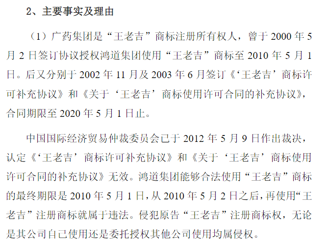 广药集团认为,鸿道集团能够合法使用王老吉商标的最终期限是2010年5月1日,此后若再使用王老吉注册商标就属于违法,无论是其公司自己使用还是委托授权其他公司使用均属侵权。于是,广药集团在2014年向广东高院提起了民事起诉。