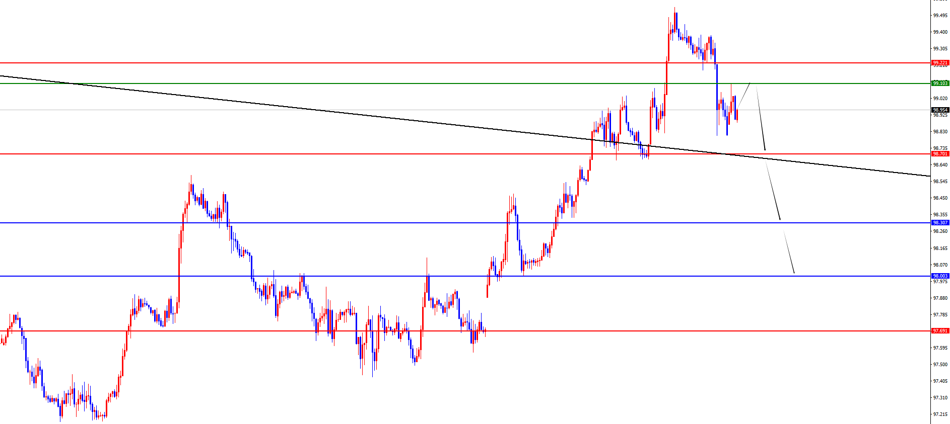 从多周期分析,周线价格经过前期持续震荡后于上周进行站稳,目前周线支撑于98区域,后续关注进一步中期多头。从日线级别看,随着时间的推移目前日线支撑于98.30区域,价格此位置之上波段进一步上涨。从四小时上看,在上周五价格跌破四小时支撑位置,则短线偏承压,同时我们需要注意上周跳空缺口位置,目前四小时阻力于99.10-20区间,价格在此位置之下先看承压,下方关注98.70-98.30及周线支撑98区域。一小时上目前价格承压还没有结束,短线先关注进一步承压表现。