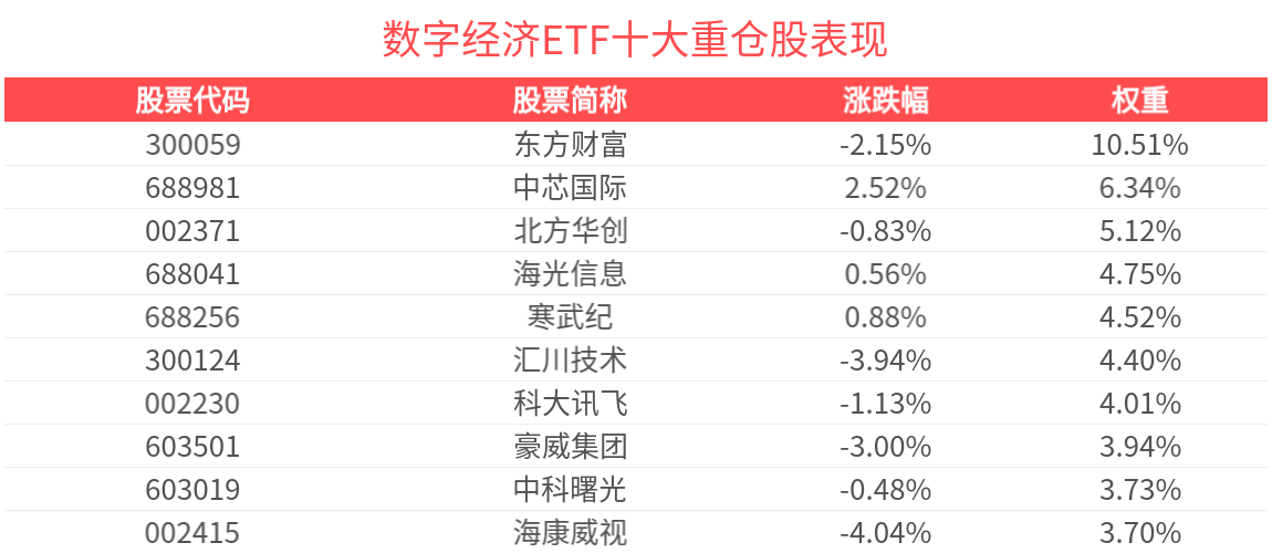 数据显示,截至2025年9月30日,中证数字经济主题指数(931582)前十大权重股分别为东方财富(300059)、中芯国际(688981)、寒武纪(688256)、海光信息(688041)、北方华创(002371)、澜起科技(688008)、中科曙光(603019)、汇川技术(300124)、兆易创新(603986)、中微公司(688012),前十大权重股合计占比54.31%。