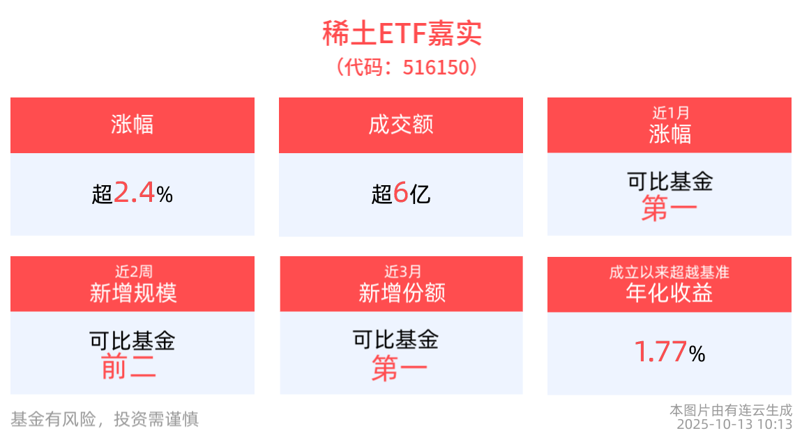 流动性方面,稀土ETF嘉实盘中换手8%,成交6.38亿元。拉长时间看,截至10月10日,稀土ETF嘉实近1周日均成交5.98亿元,排名可比基金第一。