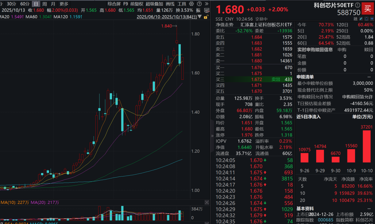 10月13日,受贸易摩擦消息影响,A股早盘低开。自主创新主旋律持续奏响,科创芯片板块低开冲高,强势翻红,早盘盘整后,展开二次冲锋!截至10:24,科创芯片50ETF(588750)大涨2%,资金持续汹涌布局,科创芯片50ETF(588750)近8日获资金累计净流入超15亿元!