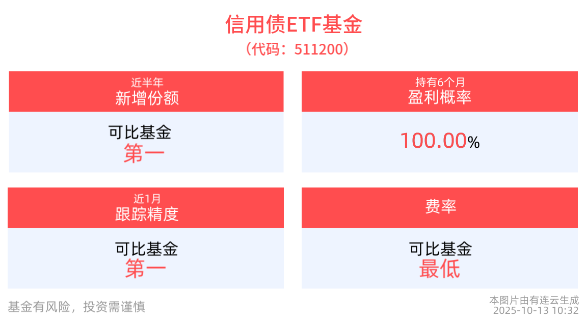 跟踪精度方面,截至2025年10月10日,信用债ETF基金近1月跟踪误差为0.005%,在可比基金中跟踪精度最高。