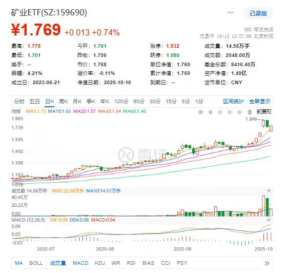 2025年10月13日,资源板块表现强劲,矿业ETF(159690)盘中一度上涨1.08%。成分股中,北方稀土、盛和资源、湖南白银等涨幅领先。资金流向数据显示,截至10月10日,该基金已连续3日获得资金净流入,累计约8700万元。