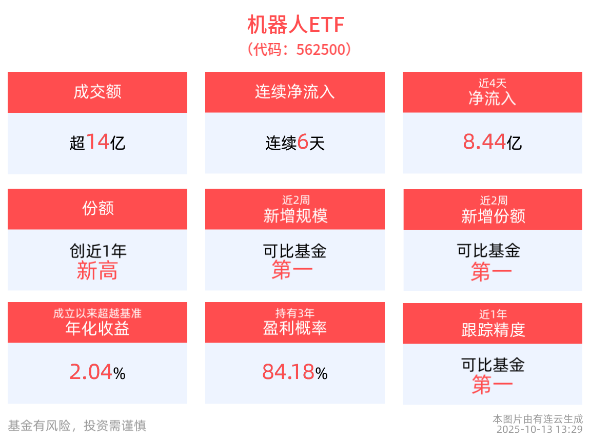 机器人ETF(562500),场外联接(华夏中证机器人ETF发起式联接A:018344;华夏中证机器人ETF发起式联接C:018345)。