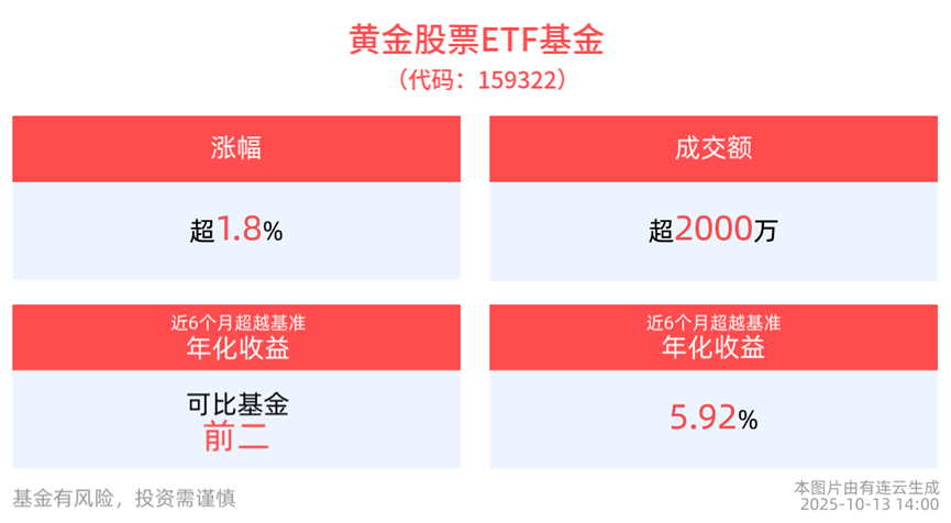 截至2025年10月13日 14:00,中证沪深港黄金产业股票指数(931238)强势上涨2.48%,成分股豫光金铅(600531)上涨10.04%,西部黄金(601069)上涨10.00%,晓程科技(300139)上涨8.81%,赤峰黄金(600988),中金黄金(600489)等个股跟涨。黄金股票ETF基金(159322)上涨1.84%,最新价报1.72元。拉长时间看,截至2025年10月10日,黄金股票ETF基金近2周累计上涨10.11%。