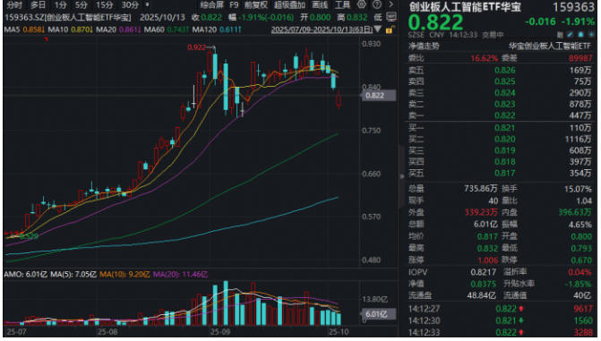 热门ETF方面,同类规模最大、流动性突出的创业板人工智能ETF(159363)盘中触及5%跌幅,现跌幅收窄至2.86%,实时成交额超5亿元。