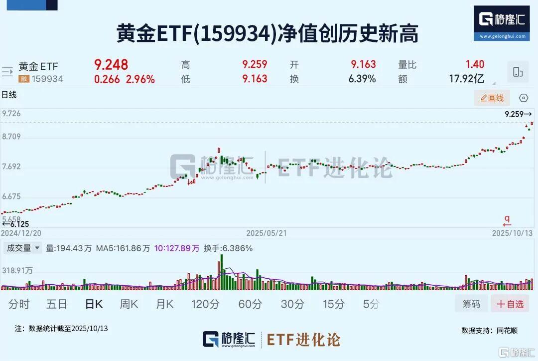 黄金ETF(159934)今日大涨2.96%,年内涨49.4%,创历史新高,年内资金净流入超69亿元,最新规模273.18亿元,可T+0交易。
