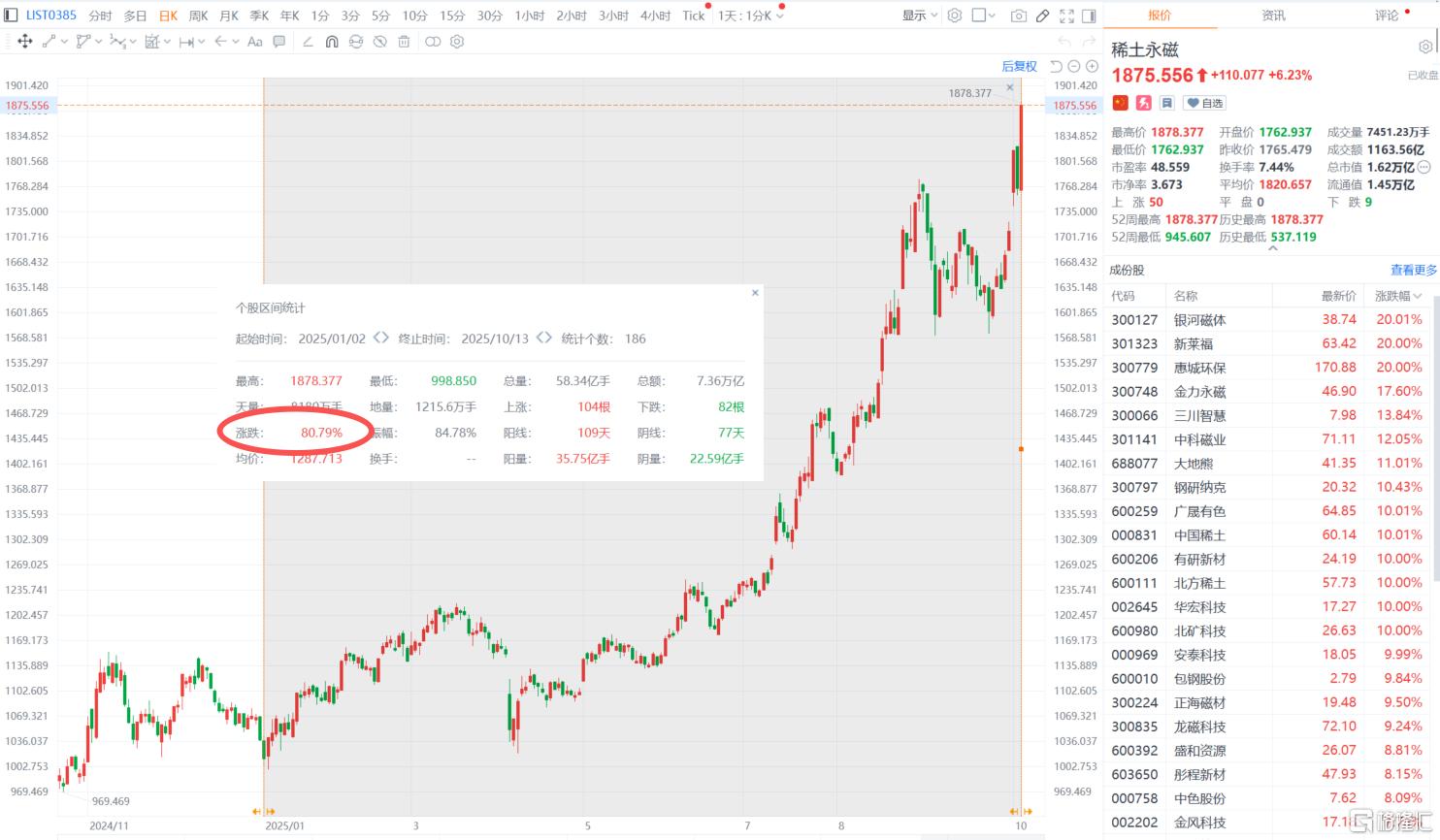 今年来,稀土永磁板块强势起飞,年内累涨超80%。其中,累涨超100%的“翻倍股”已达十余只。