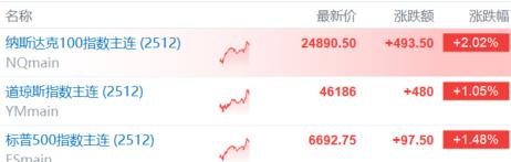 今天,美股三大股指期货走高。纳斯达克100指数期货涨幅达2%,道指期货涨1.05%,标普500指数期货涨近1.5%。
