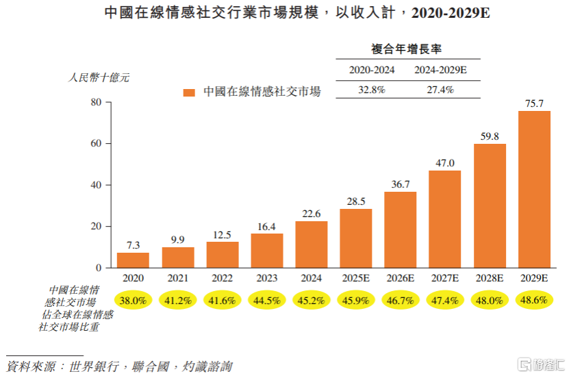 近年来,全球在线情感社交市场发展迅速,2024年规模达到499亿元,预计到2029年将增长至1559亿元。