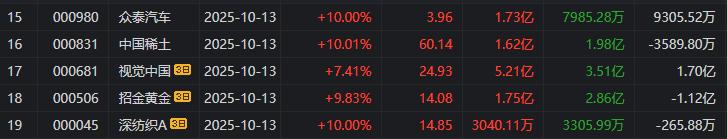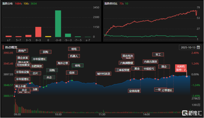10月13日,沪深两市成交额2.35万亿,较上一个交易日缩量1609亿。盘面上,稀土永磁、贵金属、光刻机、半导体、小金属、军工装备等板块涨幅居前,汽车零部件、游戏、消费电子、文化传媒、减肥药等板块跌幅居前。