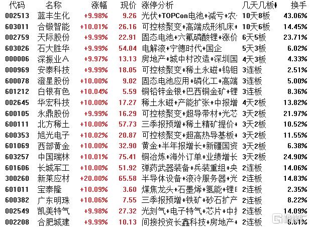 高位股方面,蓝丰生化10天8板、可控核聚变概念股合锻智能10天6板、六氟磷酸锂概念股天际股份6天5板、石大胜华5天3板、深振业A4天3板、安泰科技3连板、新莱应材20CM2连板。