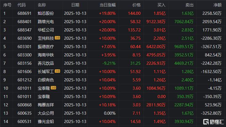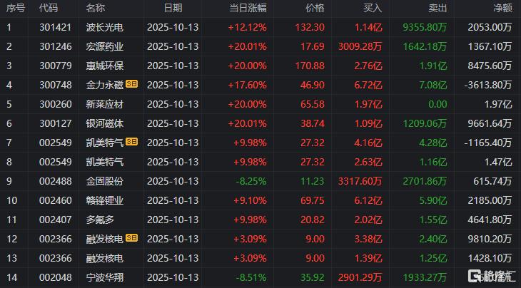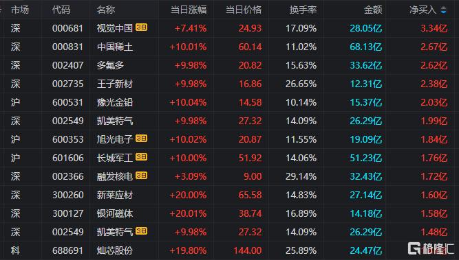 龙虎榜单日净买入额前三为中国稀土、多氟多、王子新材,分别为2.67亿元、2.62亿元、2.38亿元。