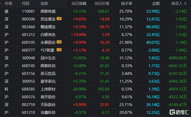 龙虎榜单日净卖出额前三为赣锋锂业、白银有色、冠中生态,分别为1.65亿元、1.53亿元、8890.80万元。
