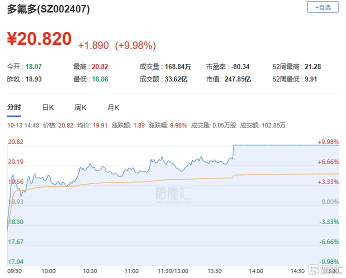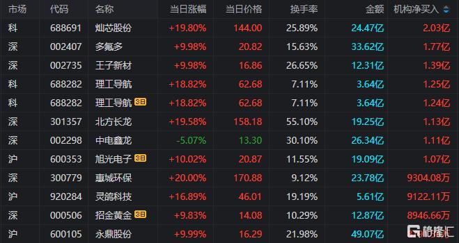龙虎榜中涉及机构专用席位的个股中,当日净买入额前三为多氟多、王子新材、北方长龙,分别为1.77亿元、1.39亿元、1.13亿元。