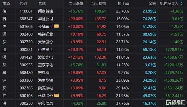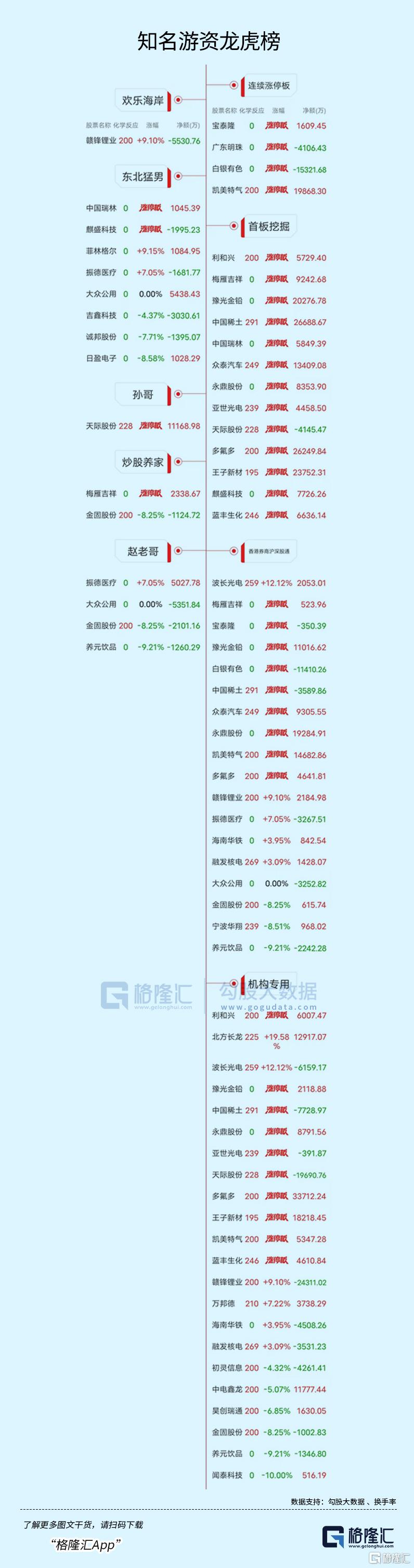 龙虎榜中涉及机构专用席位的个股中,当日净卖出额前三为赣锋锂业、天际股份、中国稀土,分别为1.53亿元、1.49亿元、7728.97万元。