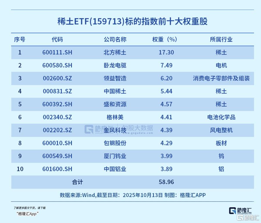 该ETF跟踪的中证稀土产业指数,全面覆盖稀土采掘、冶炼加工及高端应用领域,重点布局稀土、磁性材料、电机等关键环节,聚焦行业龙头与核心技术企业,成份股中北方稀土+中国稀土+包钢股份占比31.6%,能实现一键分享稀土板块的时代红利。