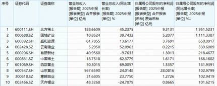 基本面上,根据2025年中报,中证有色金属指数60只成份股中,55股上半年实现盈利,占比超91%。从归母净利同比增速来看,10股实现翻倍,北方稀土净利暴增1951%居首,国城矿业归母净利亦暴增1111%。