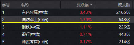 关税扰动再起,国防军工板块走出独立行情,行业涨幅在30个中信一级行业中高居第二,仅次于有色金属。